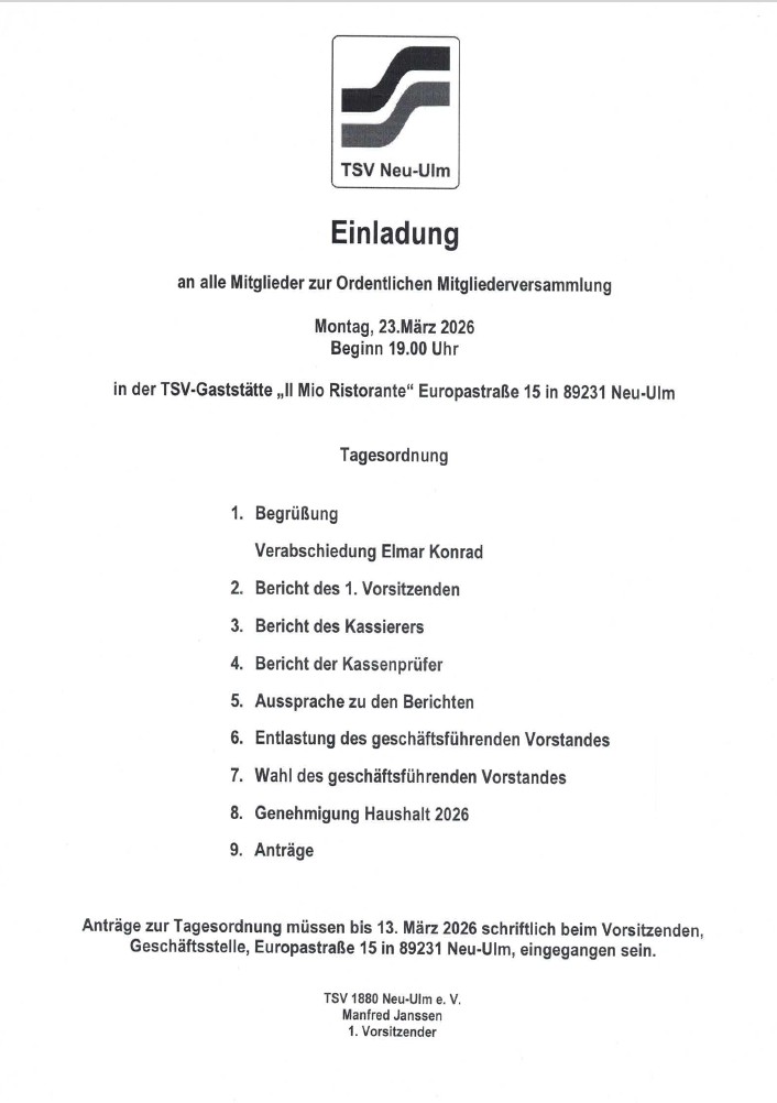 Einladung zur Mitgliederversammlung 23.03.26 19 Uhr Il Mio Beitrag veröffentlicht:3. März 2026 Beitrags-Kategorie:Aus der Geschäftsstelle Beitrags-Kommentare:0 Kommentare Please Share This Diesen Inhalt teilen Öffnet in einem neuen Fenster WhatsApp Öffnet in einem neuen Fenster Facebook Öffnet in einem neuen Fenster X Öffnet in einem neuen Fenster LinkedIn Das könnte dir auch gefallen JHV TSV Neu-Ulm 08.04.25 18 Uhr im Il Mio 25. März 2025 Bayrische Einzel- und Mannschaftsmeisterschaften am Sa. 03.05.25 und So. 04.05.25 in der GBH Neu-Ulm 7. März 2025 Neuer Vorsitzender BLSV-Sportkreis Neu-Ulm 18. Juni 2025 Schreibe einen Kommentar Antwort abbrechenKommentierenGib deinen Namen oder Benutzernamen zum Kommentieren ein Gib deine E-Mail-Adresse zum Kommentieren ein Gib deine Website-URL ein (optional) Meinen Namen, meine E-Mail-Adresse und meine Website in diesem Browser für die nächste Kommentierung speichern. Δ